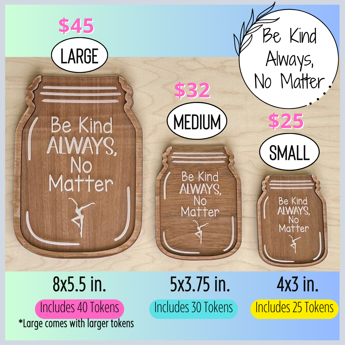 - Includes: 25-40 assorted acrylic tokens depending on size of jar.