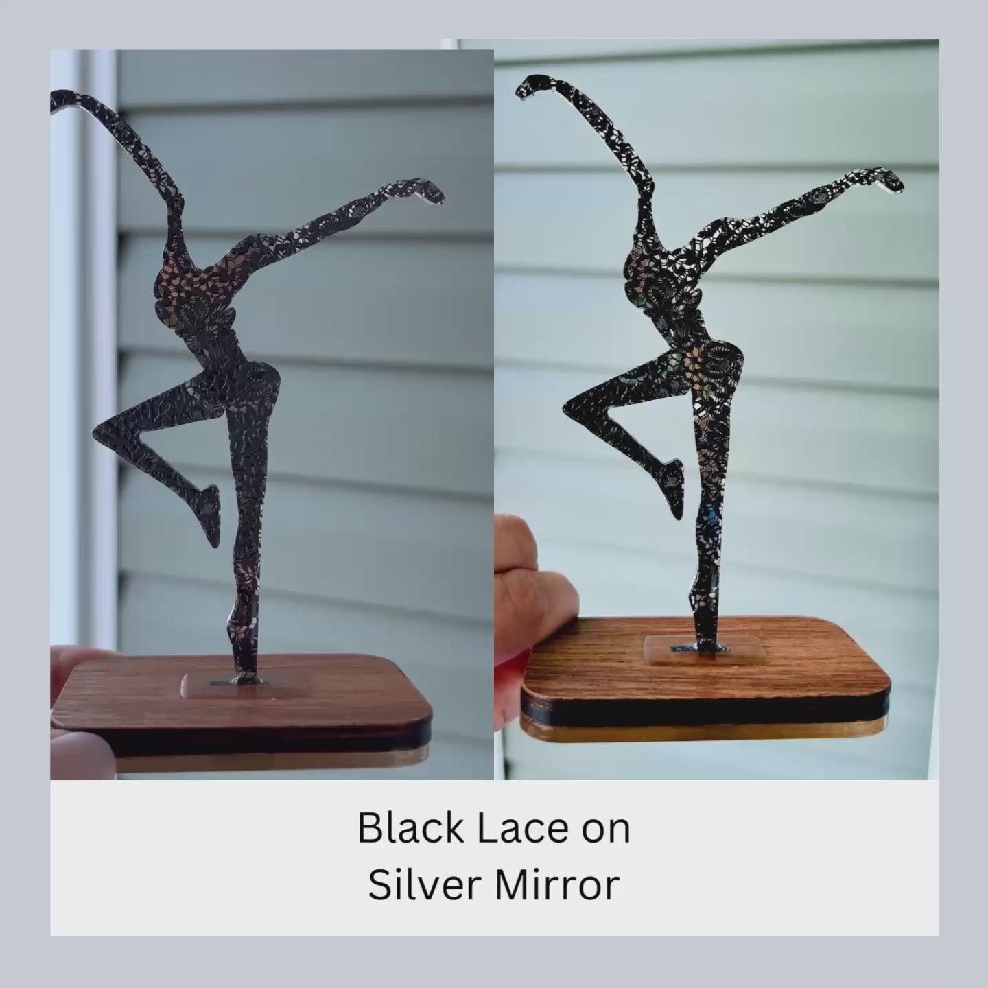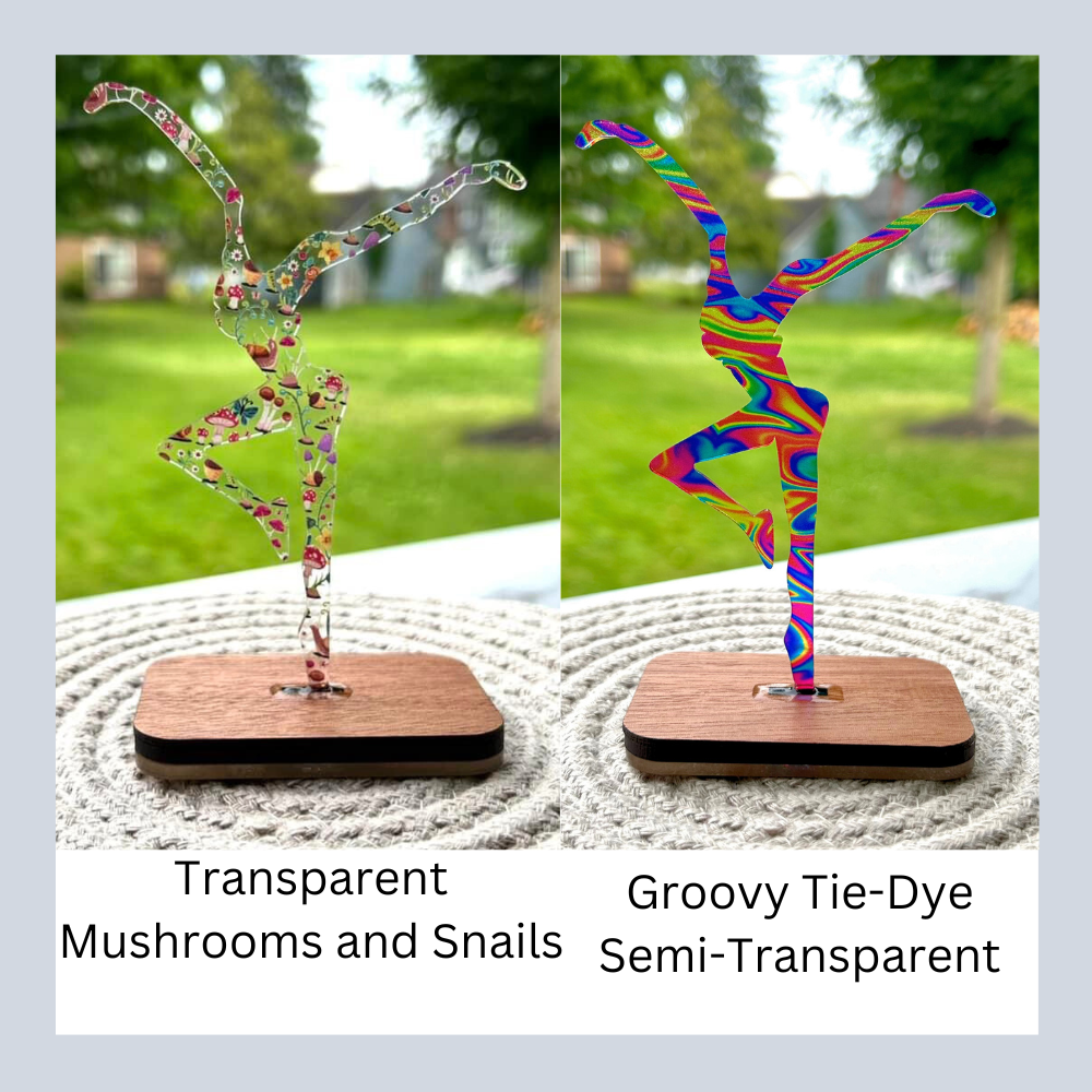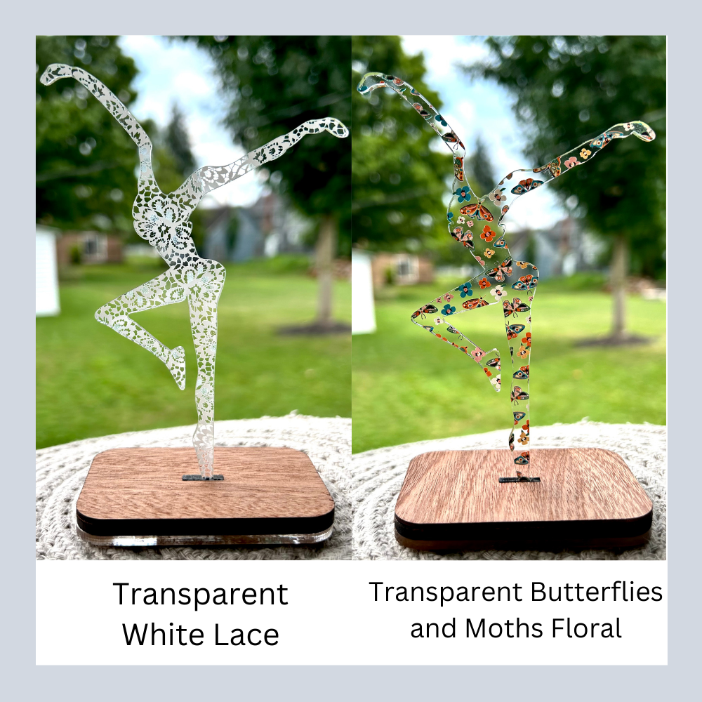 Each piece of Shelf Decor is thoughtfully chosen and crafted from premium acrylic. The acrylic has a thickness of 1/8 inch and stands at 5.25 inches tall. The top base is constructed from solid wood, sealed for durability, while the bottom base is made of clear acrylic, providing water resistance and safeguarding your surfaces.
